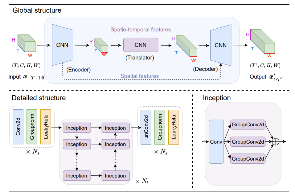 翻译器使用 $N_t$ 个 Inception 模块来学习时间演变,即在 $(H, W)$ 上进行 $T*C$ 通道的卷积。