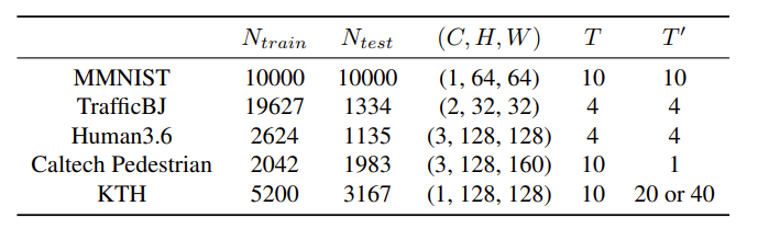 给定一个在时间 $t$ 的包含过去 $T$ 帧的视频序列 $X_{t,T}={x_{i}}^t_{t-T+1}$,而目标是在时间 $t$ 预测未来的序列 $Y_{t,T’} = {x_{i}}^{t+T’}t$。该序列包含接下来的 $T’$ 帧,其中 $x{i}$ 是一个具有通道数 $C$,高度 $H$ 和宽度 $W$ 的图像。形式上,预测模型是一个映射 $F_\Theta:X_{t,T}->Y_{t,T’}$,其中的可学习参数 $\Theta$ 通过以下公式优化: