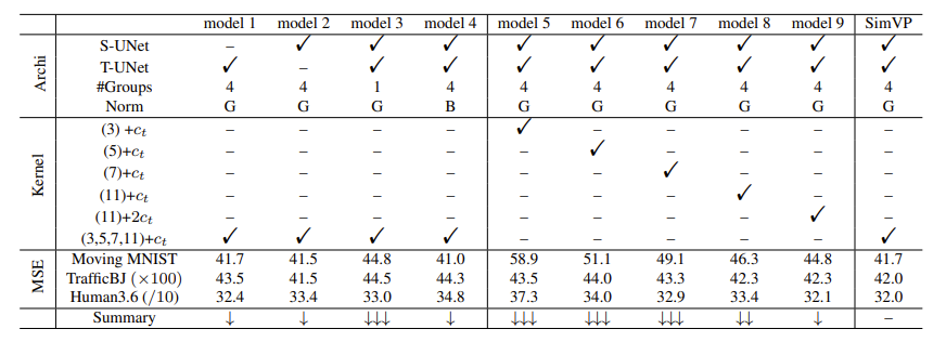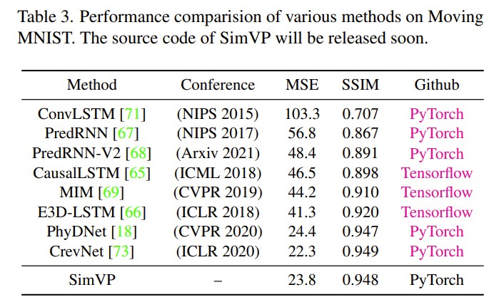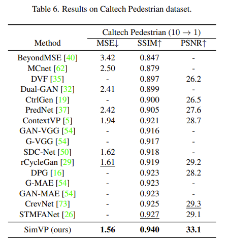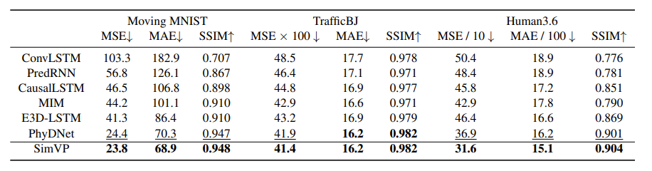 可以看到,SimVP、PhyDNet和CrevNet显著优于先前的方法,MSE降低达到42%。然而,SimVP比PhyDNet和CrevNet简单得多,没有使用RNN、LSTM或复杂模块。