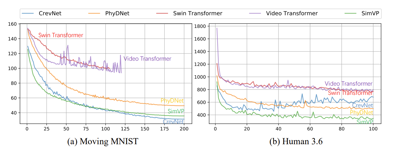由上可知,SimVP 的训练过程比其他方法快得多,所以 SimVP 可以更容易地使用与扩展。