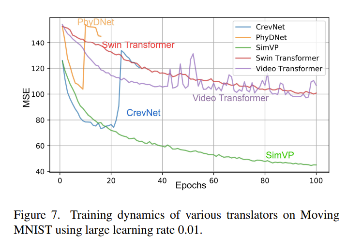 - 在类似的资源消耗下,Transformer在我们的SimVP框架中没有优势。