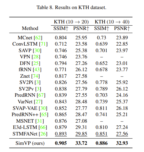 可以看到,SimVP 在灵活预测长度的情况下扩展良好。SimVP 达到了最新的性能。