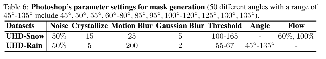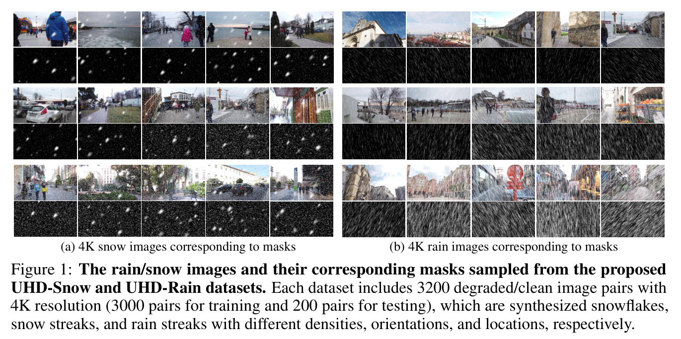 作者构建了两个新的基准,分别为:UHD-Snow 和 UHD-Rain。每个数据集包括 3200 对退化/清晰的 4 K 图像对,这些图像分别合成了不同密度、方向和位置的雪花和雨条纹。其中,3000 对用于训练,200 对用于测试。