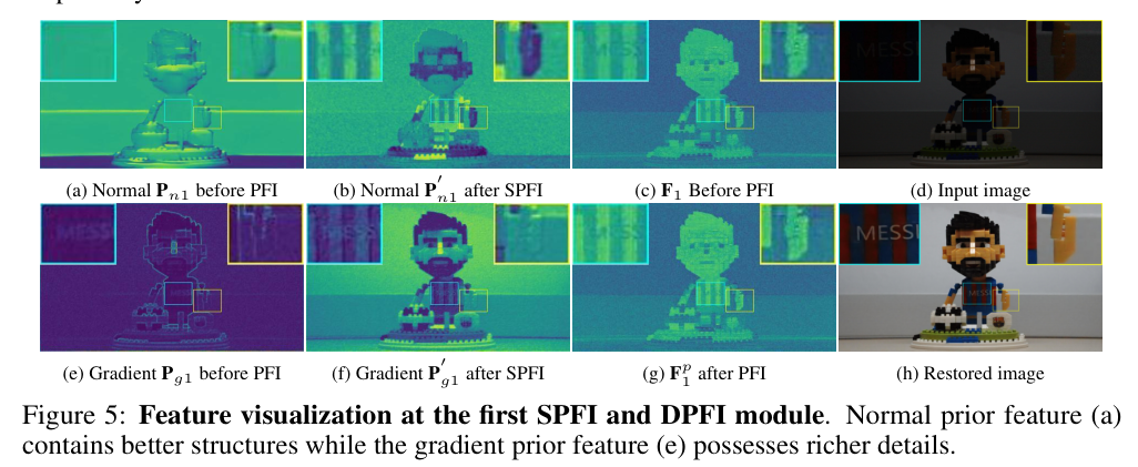 图片在进入第一个 SPFI 之前提取正常与梯度先验的特征(图 a, e)。正常特征自然提供了更精细的任何结构,而梯度特征包含了更多的纹理细节,它们可以提供互补信息。这些特征分别通过 SPFI 模块与高分辨率特征集成,来进一步增加相应的结构与细节(图 b, f)