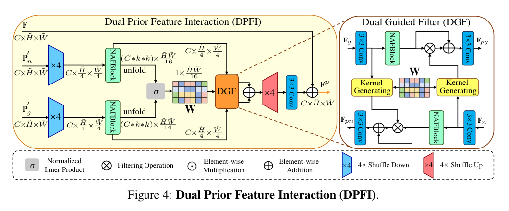 $\otimes$ 是过滤操作,注意这里的 $F_n$ 和 $F_g$ 是通过一个 3×3 卷积和一个 NAFBlock 获得的。最后,先验特征被添加到从高分辨率传下来的低分辨率特征中,以生成交互的先验特征 $F_g$ 。