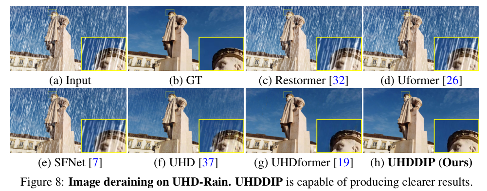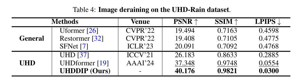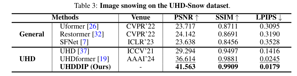 在三个超高清图像修复任务上,与最先进的方法进行了定性和定量的比较,包括:(a) 低光增强,(b) 去雪,和 (c) 去雨。