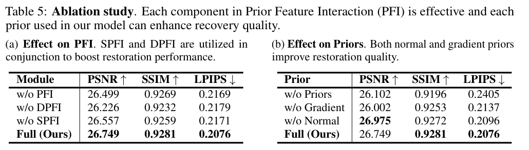 表 b 表示了先验(法线与梯度)的影响。可以发现,法线有助于 SSIM(结构相似性指数)与 LPIPS(感知图像质量评估指标)的提升。结合使用时,SSIM 与 LPIPS 方面达到最佳性能。