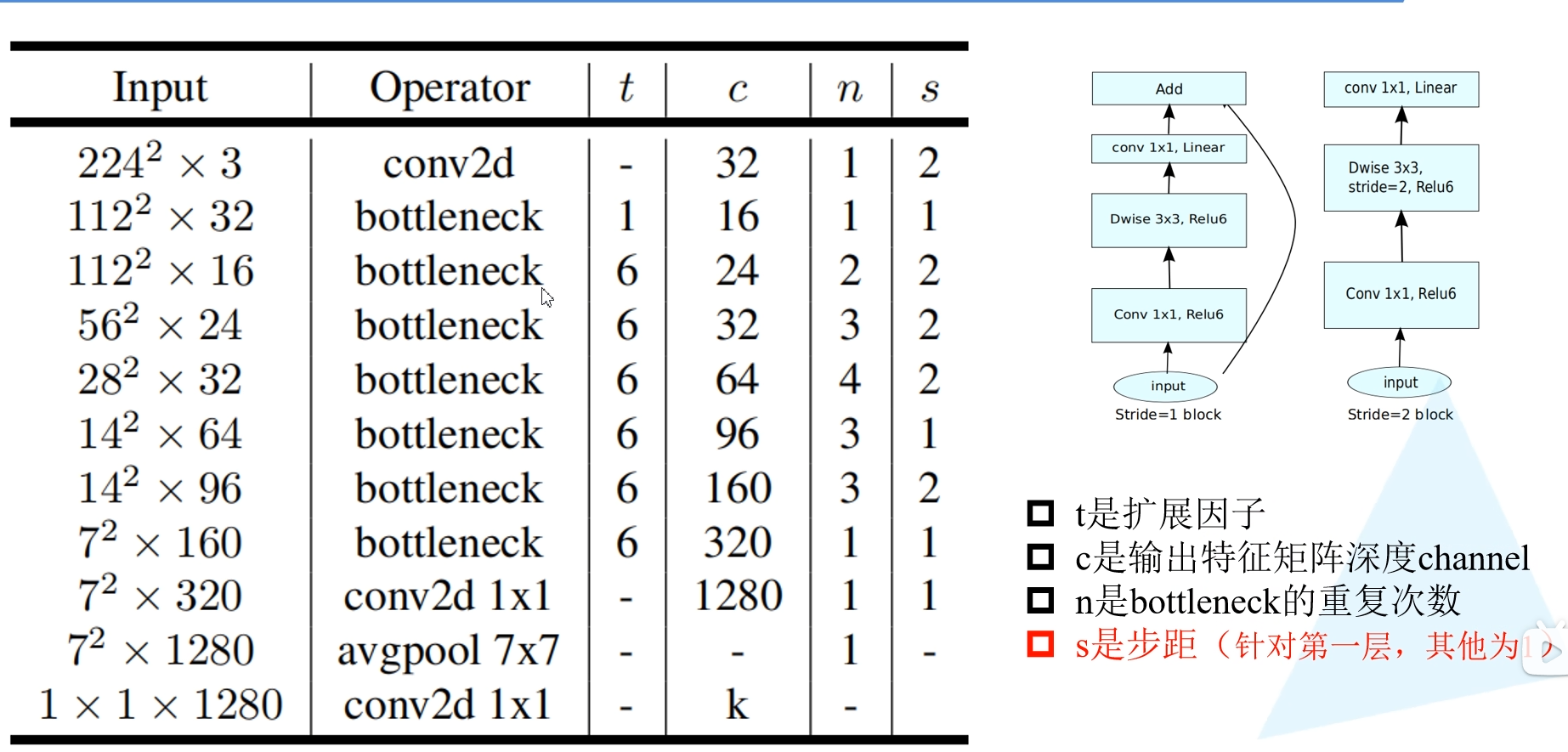 - 对于每一个 stage 中的第一个使用的是 stride=2 的 block