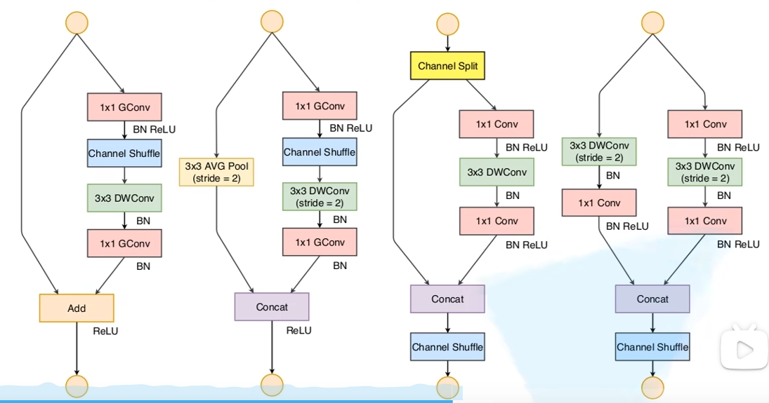 concat,因为在一开始,将数据分割开了,所以这里要拼接。 Element-wise操作(ReLU,depth-wise)只在一个分支中存在。(V 1 中,合并之后还有一个 ReLU,而 V 2 中,拼接以后就不会使用 ReLU了)- 连续的
