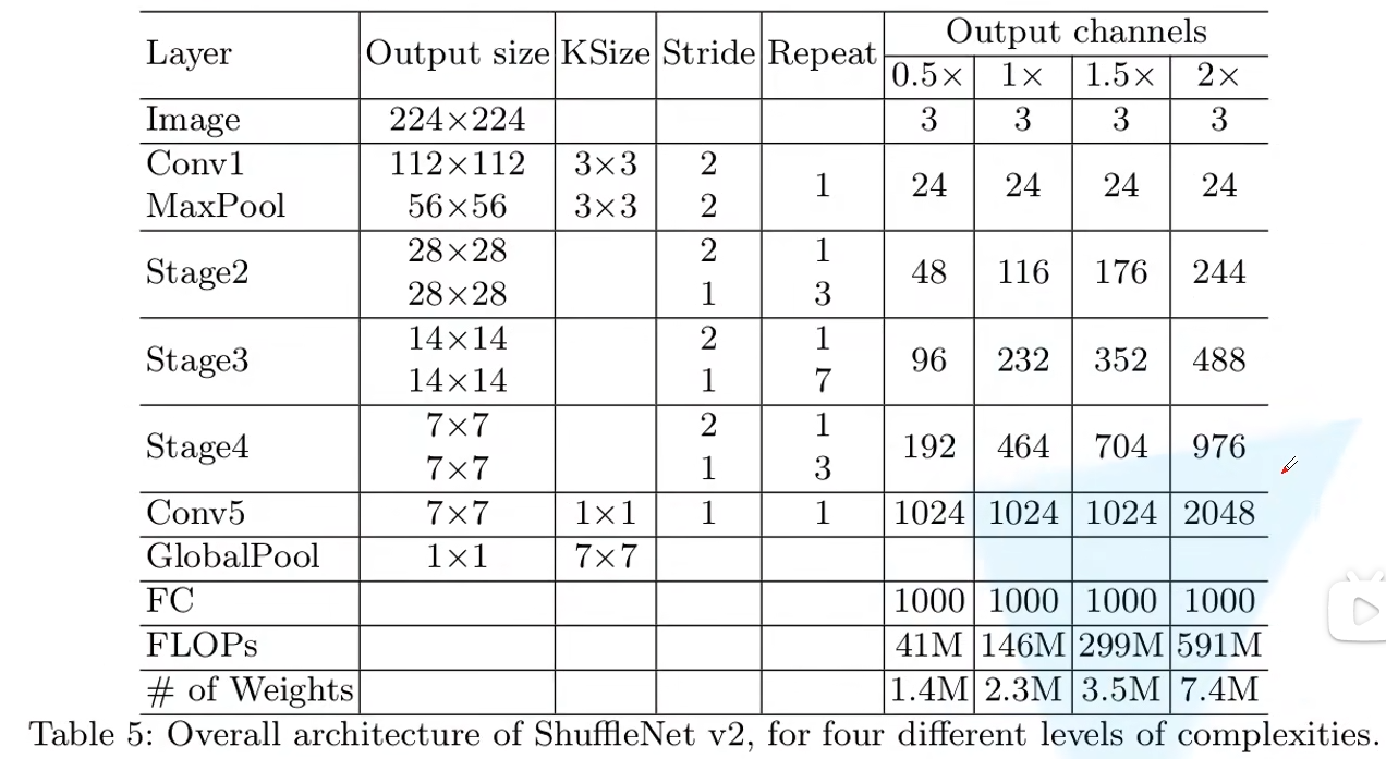 - 在一个 unit 中, 第一个分组卷积与第二个 DW 卷积的输出通道数为当前 stage 输出通道卷的 1/4