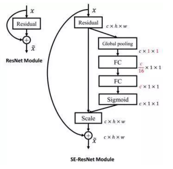 左侧为原始的残差神经网络的结构图,而右侧为应用了 SE 模块的残差神经网络