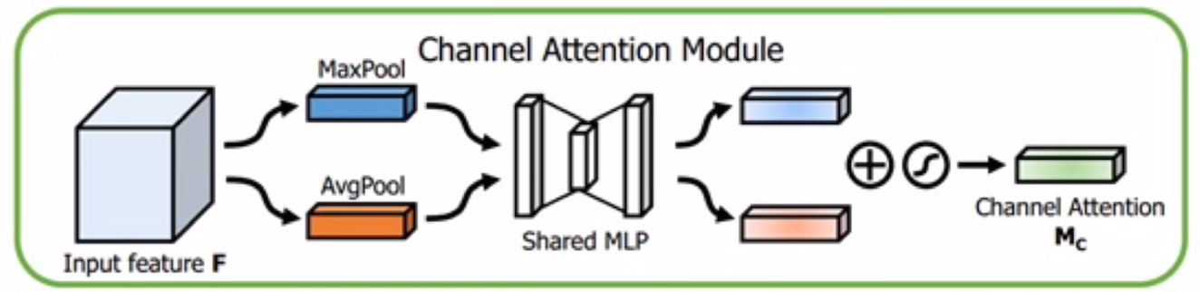 相比对 SENet,对于通道注意力使用了最大池化与平均池化,并且使用了共享的 MLP,将得到的两个权重进行相加,最后才得到输出的通道权重。