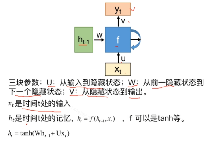 - 输出 y 不仅由当前的输入所决定,还会考虑到之前的“记忆”。由两者共同决定。