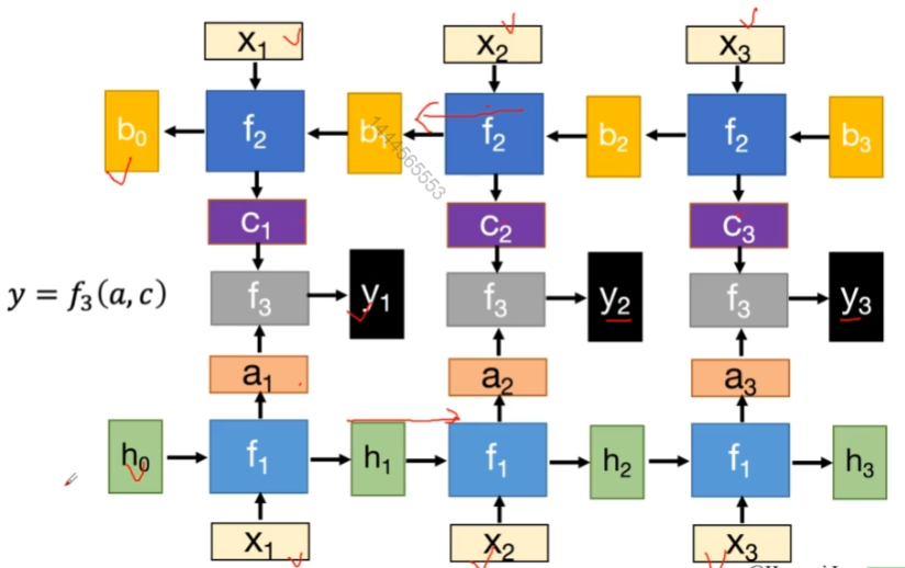 两个传递方向相反的 RNN 网络,然后由一个函数 f,将对应的值整合输出。