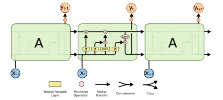 - LSTM 有三个门计算,即遗忘门,输入门,输出门。