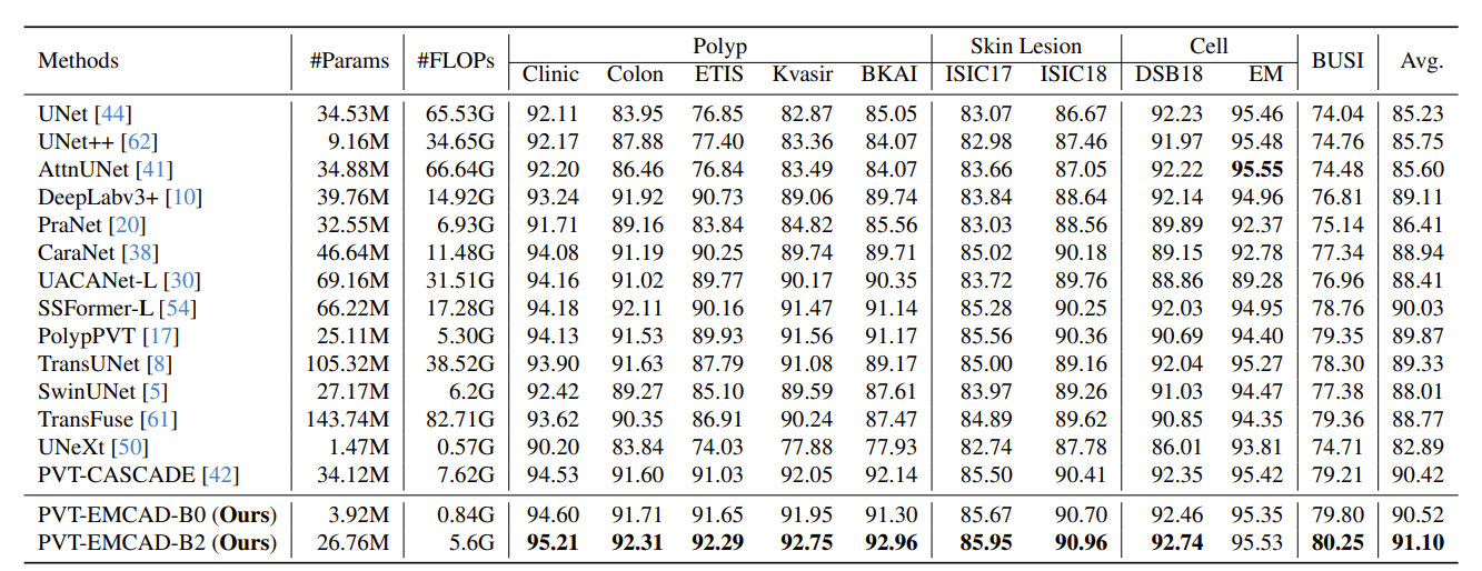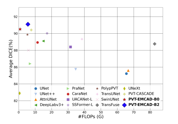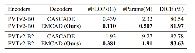 通过使用分组与深度卷积,EMCAD 非常高效且具有良好的扩展性。