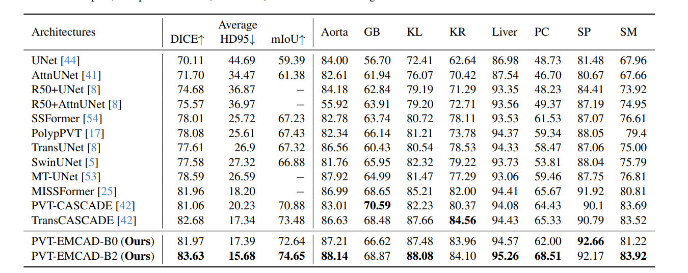 PVT-EMCAD-B2 在 Synapse 多器官数据集上的腹部器官分割表现出色,同时,EMCAD 解码器提升了单个器官分割,显著超越了 SOTA 方法在八个器官中的六个。