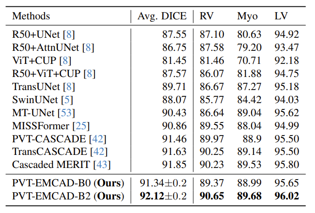 从表 1 中可以看到:该模型( PVT-EMCAD-B2)在五个息肉分割数据集上超越了所有 SOTA 方法。