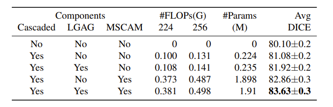 从仅使用编码器开始,然后添加不同的模块,如级联结构、LGAG 和 MSCAM,得出以下表: