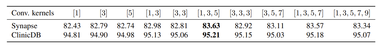 为了了解 MSDC 中用于深度卷积的不同多尺度核的效果,做了以下的实验: