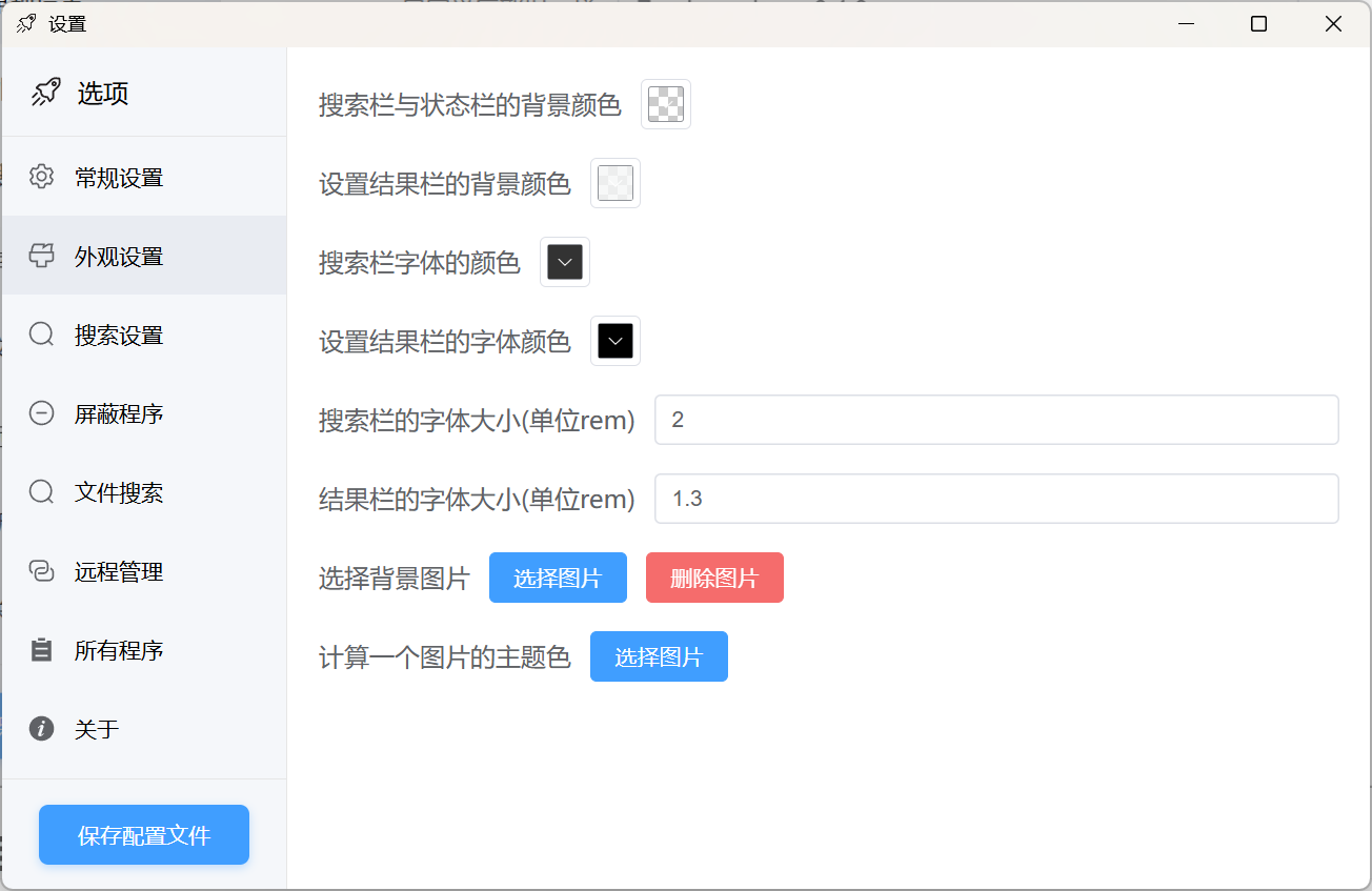 外观设置支持自定义背景图片,搜索栏的字体大小与颜色,结果栏的字体大小与颜色,结果栏中选中项的颜色等