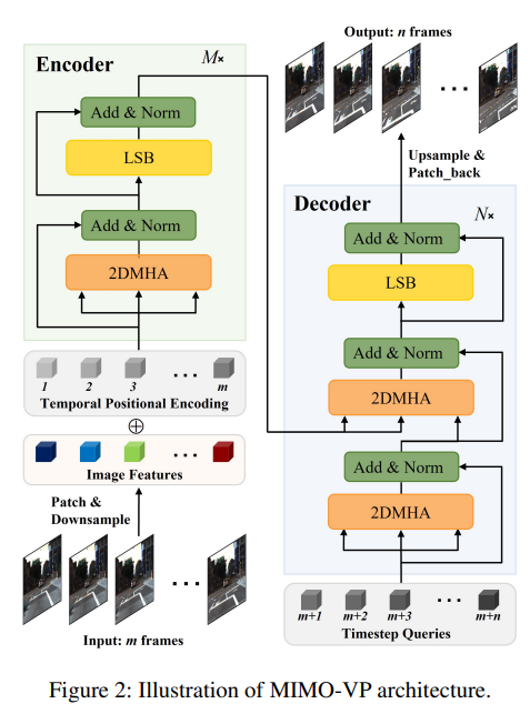 作者研究后发现,MIMO 模型可以以远超预期的大幅度优势超越最先进的工作,尤其是在处理长期误差累积方面。所以作者提出了基于纯 transformer 与局部时空块和新的多输出解码器,名字为 MIMO-VP。