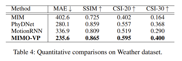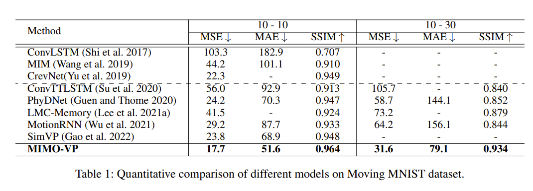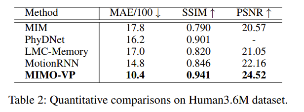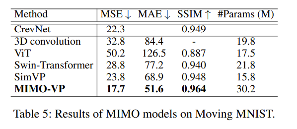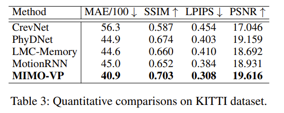 表明了 MIMO-VP 在保持未来帧之间的依赖性以进行准确预测方面的优势。