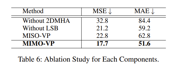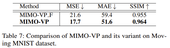 将 MIMO-VP 与其变体 MIMO-F 进行比较,后者是一个在解码器中去掉自注意力模块的基线,因此无法捕获所有帧的依赖性。