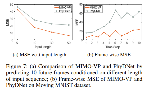 可以实现长期依赖性。从上图 a 可知,当输入的长度增加时,MSE 快速下降。并且下降幅度更快,表示在捕获视频序列的长期时空依赖性方面具有更强的能力,而基于 RNN 的 PhyDNet 由于内存容量有限而受到长期依赖问题的困扰。