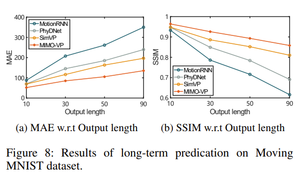 - 表明多输入多输出策略在解决视频预测中长期存在的误差累积问题中起着至关重要的作用。