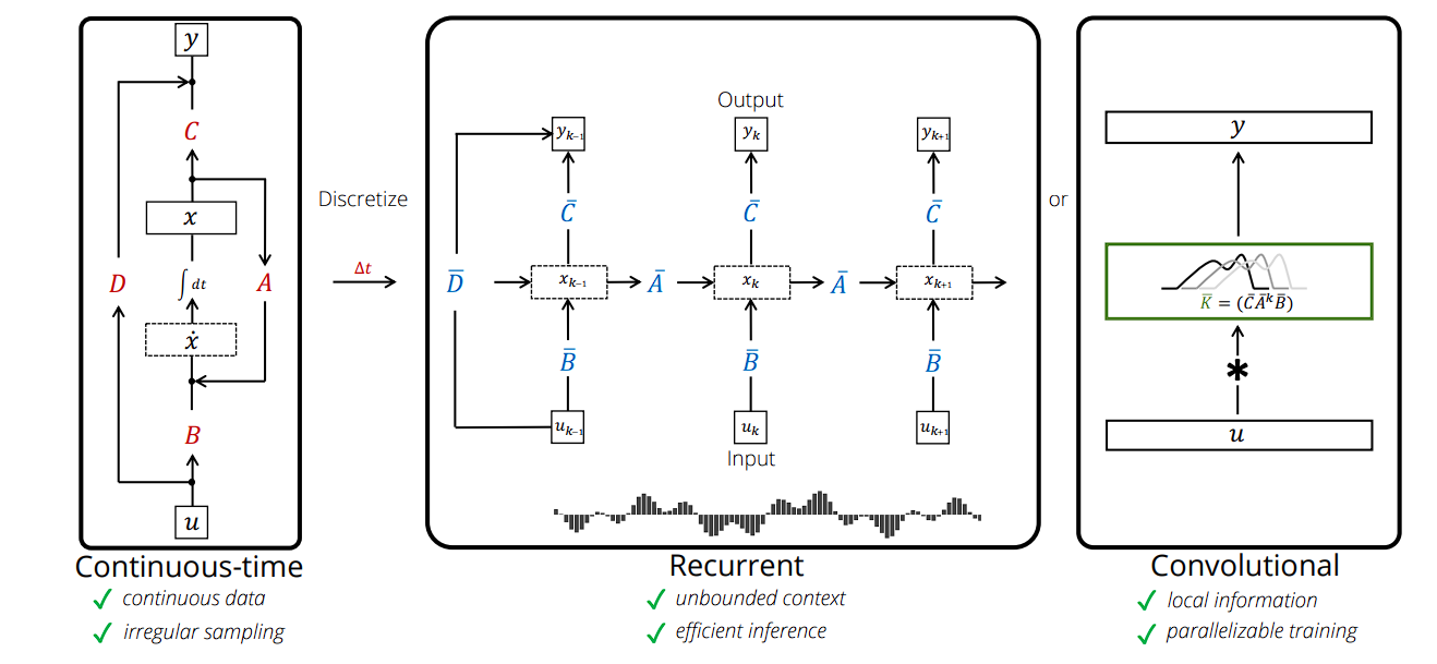 第二个式子与前面的图完全对应,就是一个 CNN 实现。时序递归状态方程改用卷积操作实现了,ABC 参数矩阵变成了 K ,就是图中的卷积核。体现在效果上,借助不同卷积核捕捉局部时间序列特征,可以同时对短期和长期依赖关系学习,并行计算提高了训练和推理的效率,使得 SSMs 在处理复杂的时序数据时表现出色。