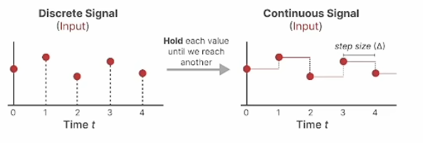 原文给出了一种从连续系统转换为系统的 ABC 参数对应关系。它其实只是一种方法的举例,叫”零阶保持(Zero-Order Hold, ZOH)”。只用知道使用了一个 delta 函数,经过一组运算,可以提到新的 A 和 B。