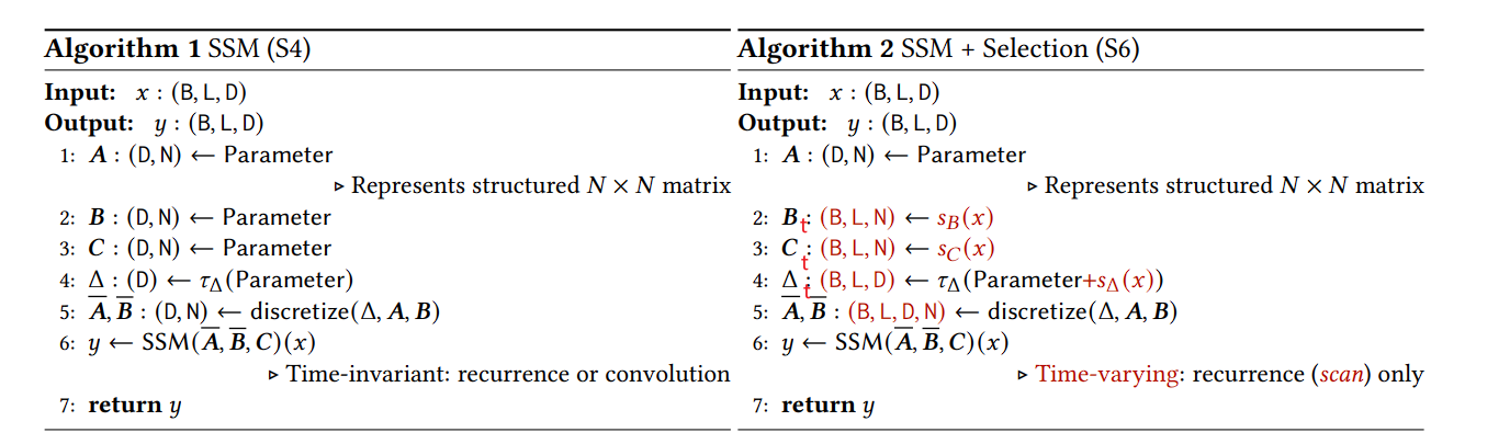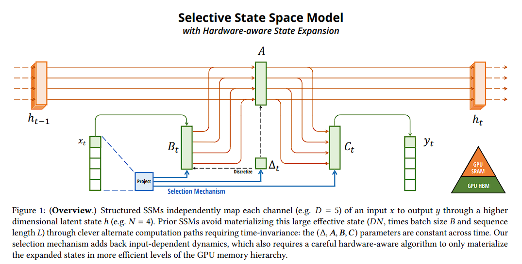 在时间序列模型中设计了一个类似于 LSTM 的门结构,实现了选择性。BC 都带了 t,变成了时变参数,A 虽然没有直接含 t,但是通过 $\Delta _t$ 也变成了时变的,$\Delta _t$ 就是前面的离散函数。下面的蓝色部分就是所谓的选择机制。