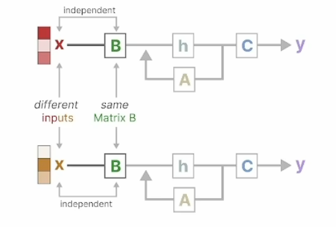 h_t = \bar{A}h_{y-1}+\bar{B}x_t