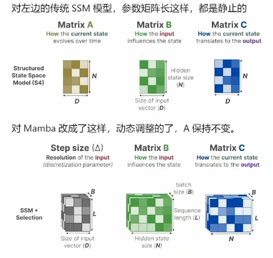 由于 SSM 有两个强假设:线性+时不变。所以极大的限制了其使用范围,因为大部分的系统是非线性,时变系统。而 Mamba 本质上是一个 SSM 模型的改进版,放开了这两个约束。