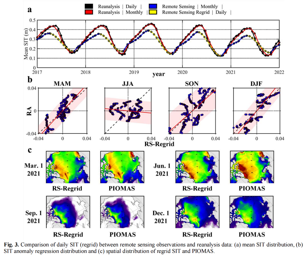从图 3 可以看到,重新网格化的 SIT 数据与遥感观测一致。同时,季节性的 SIT 周期波动也和再分析数据相似(图 3 a)。从图 3 b 可以看到,网格化的 SIT 在三季 MAM、SON 和 DJF 中的异常值与再分析数据正相关,但在 JJA 中呈现负相关。从图 3 c 中可以看出,重新网格化的 SIT 与 PIOMAS 的每日 SIT 具有相对一致的空间形态,但仍存在明显差异。