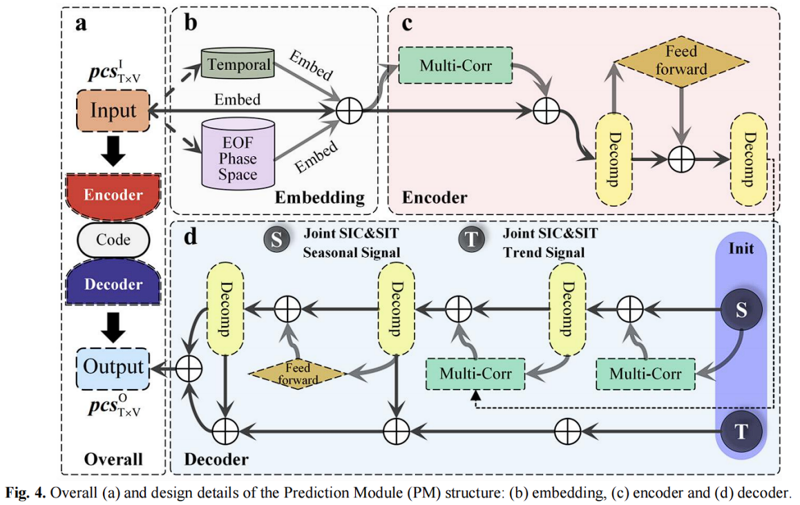从图 4 b 中可以看到,PM 的嵌入层对 EOF 相空间,时间和联合 PC 的信息分别进行嵌入映射。嵌入层由全连接层组成。同时,嵌入层不包含激活函数与偏差信息。