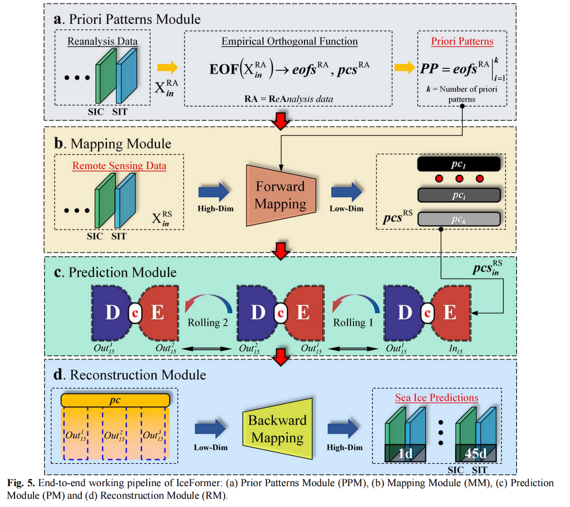基于多变量经验正交函数理论,设计了一种算法来提取海冰浓度(SIC)与海冰厚度(SIT)的同时演化先验模式。基于每日的 SIC 和 SIT,作者开发了一个深度学习建模框架,这个框架有三个核心组件,信息嵌入,编码器,解码器。通过将 iceFormer 预测系统设计为化组合,集成了先验模型模块,映射模块,预测模块和重建模块,形成了一个标准的工作流程。