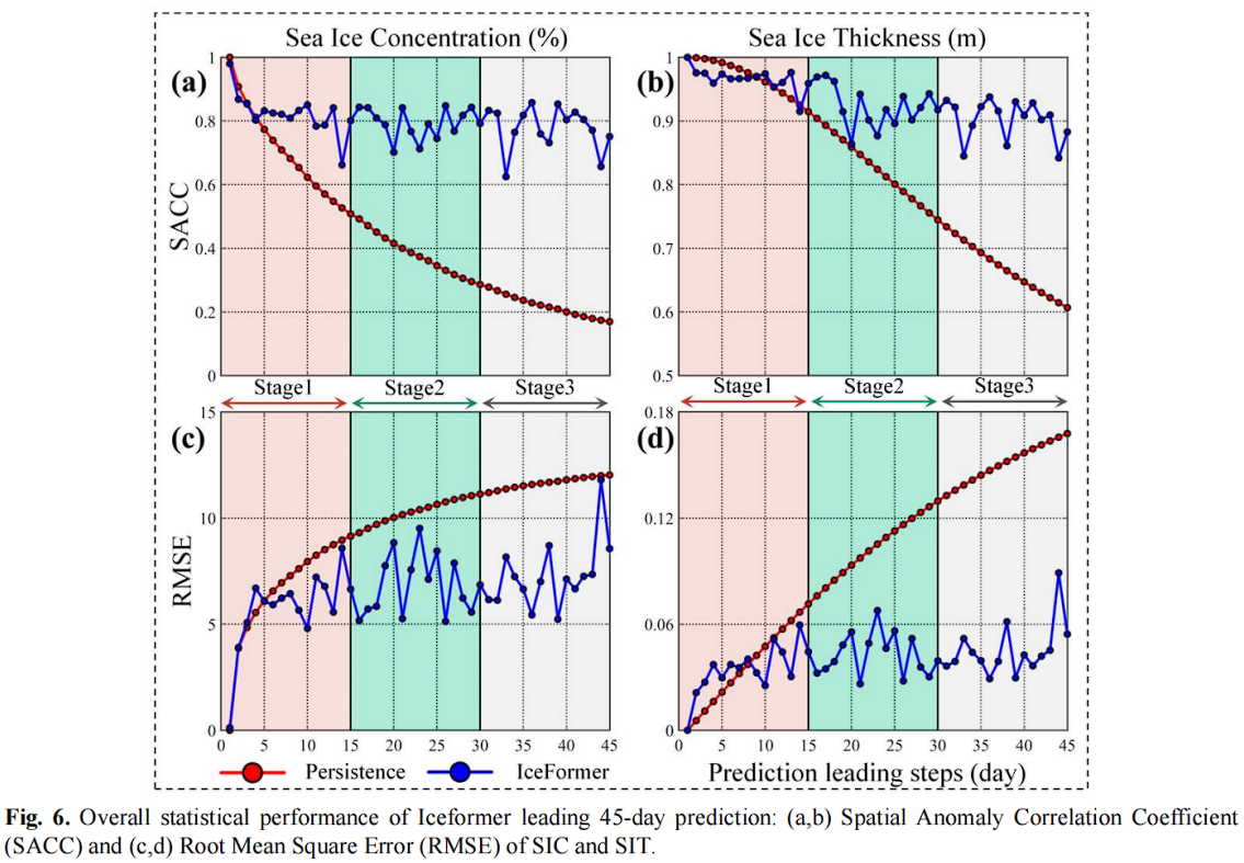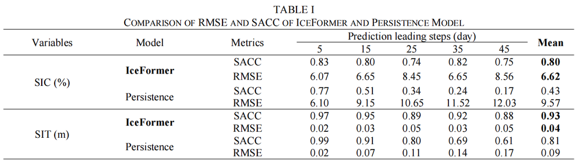 如图6所示,与基线模型相比,IceFormer在45天的海冰预测中表现远优于持续预测,这得益于IceFormer混合预测方案的设计。