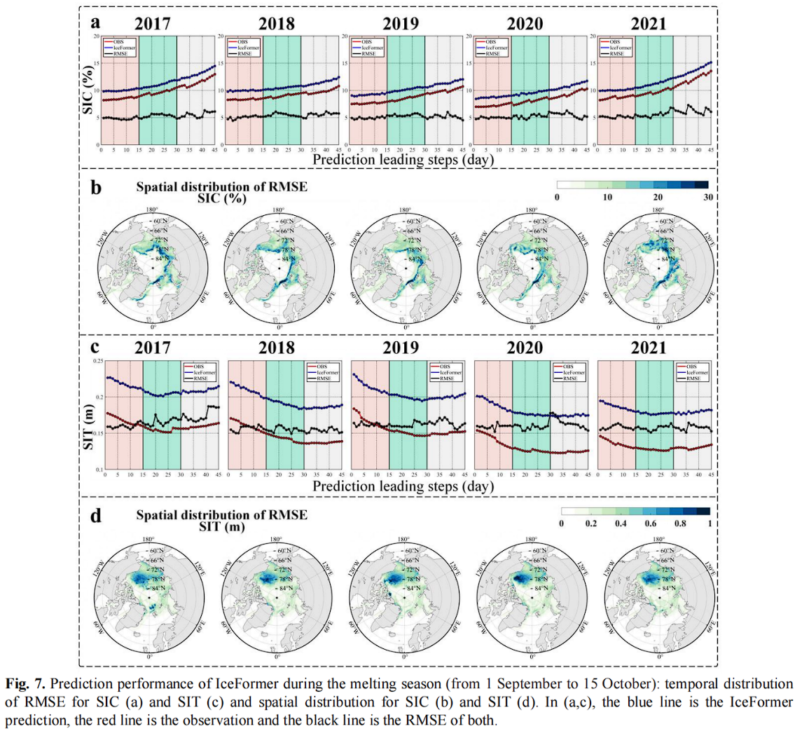 作者还展示了SIC和SIT的RMSE在时间和空间上的分布,如图7(a)-(d)所示,并重点展示了IceFormer在融冰季节的表现。