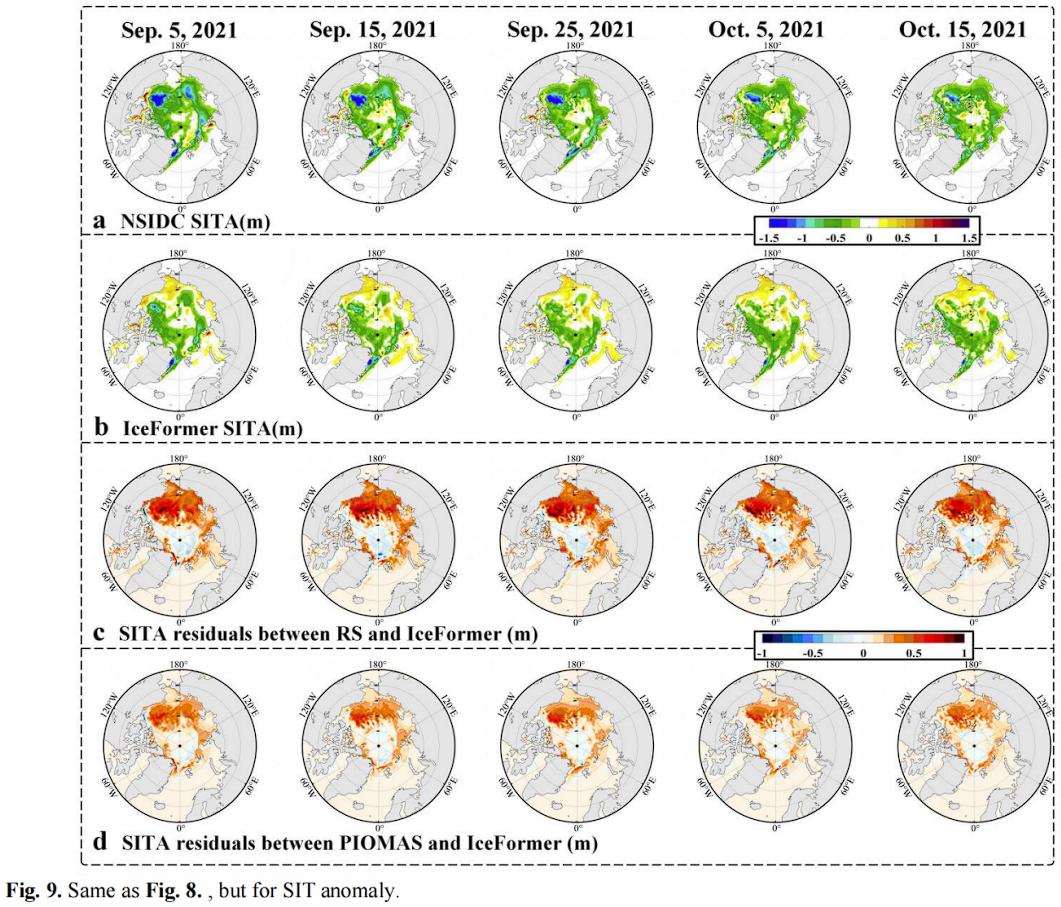 图 9 展示了 SITA 的详细信息。IceFormer的预测结果通常大于遥感观测,如图9(a)和(b)所示。