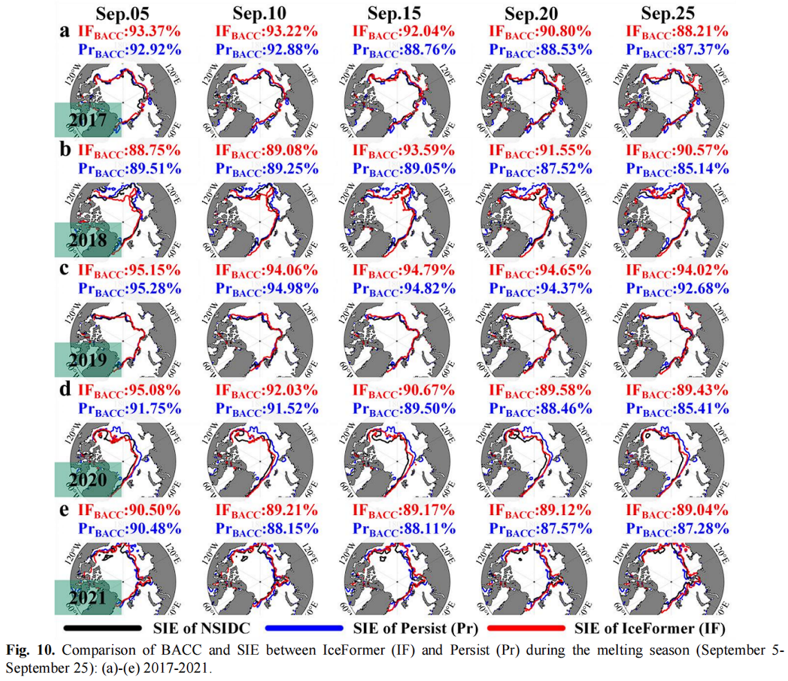 以上结果均表明,IceFormer 的预测性能可与以SEAS5为代表的复杂海冰-海洋耦合数值模型相媲美。在某些情况下,其预测结果甚至优于数值模型。