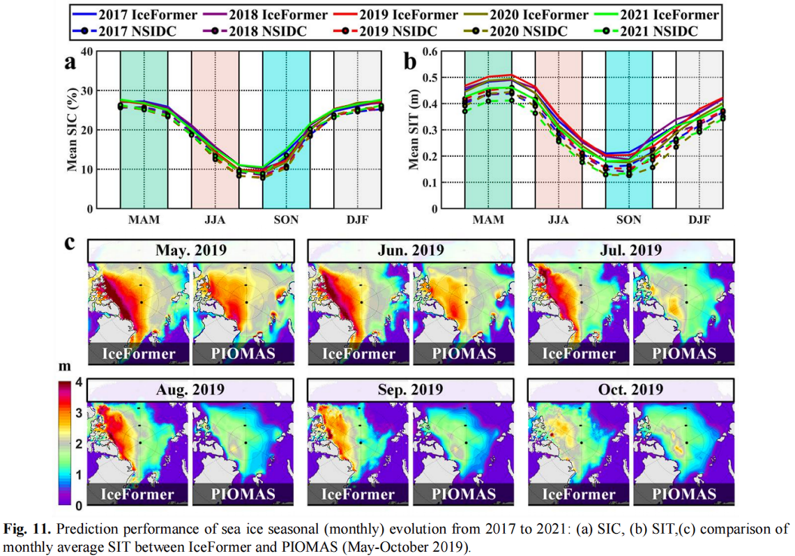 通过实验可以证明:在北极海冰的级多变量预测方面取得了进展。在遥感数据的驱动下,其预测性能远优于传统基线模型和机器学习模型。经过比较,从 5 月到 11 月,IceFormer 的 SIC 预测性能优于耦合集合数值预报模型(SEAS 5)