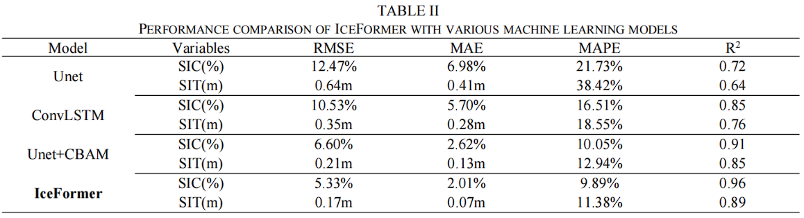 将 IceFormer 与之前用于海冰浓度(SIC)预测的三种深度学习模型进行对比,比如 Unet, ConvLSTM,融合注意力机制的 UNet。