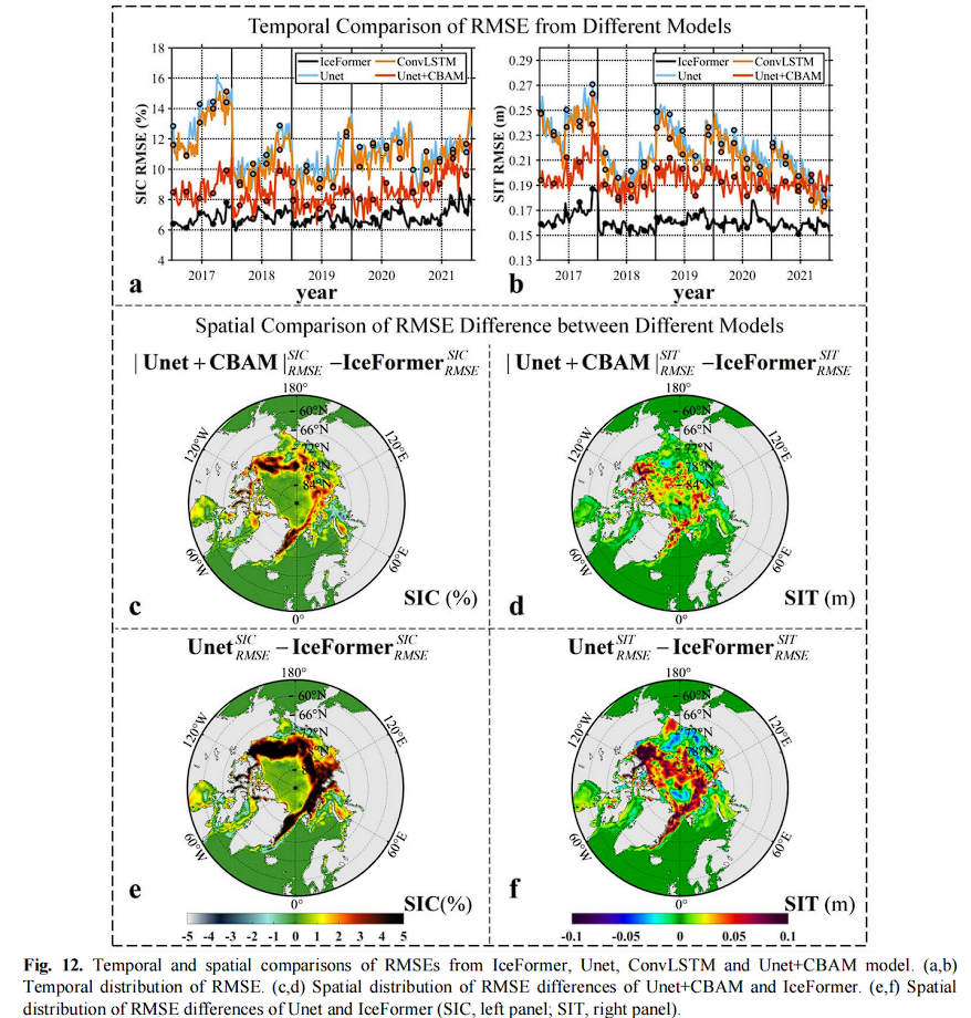 通过 SIC 的 RMSE 空间分布 (图 12(c) 和 (e))可以发现,Unet+CBAM 的预测误差比 Unet 小得多,但仍大于 IceFormer。