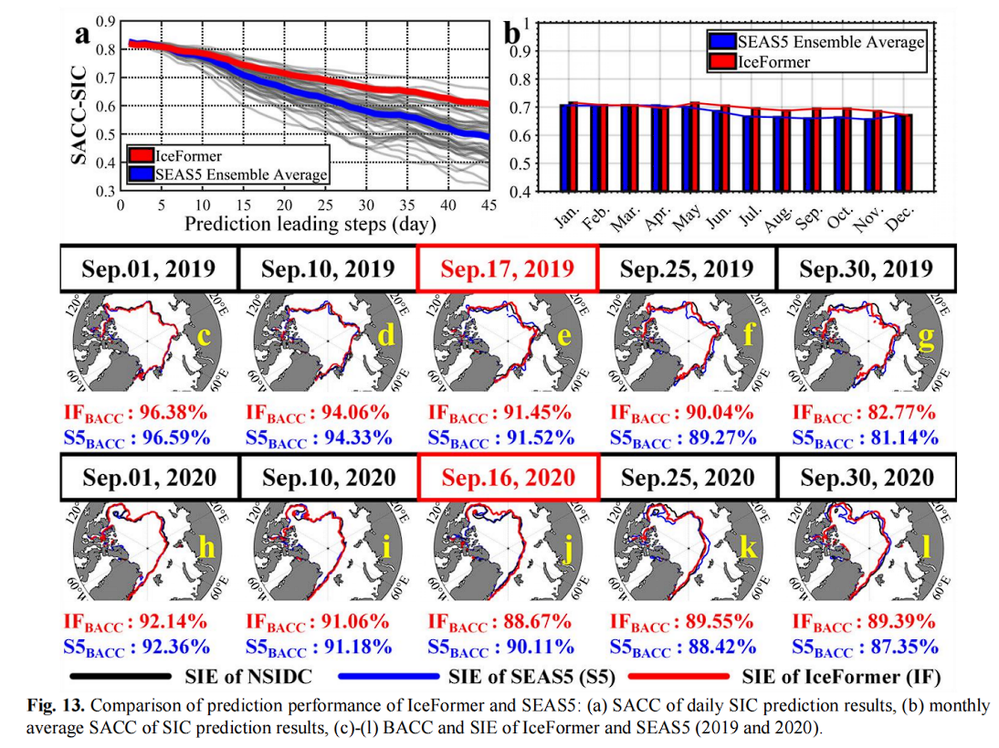 北极海冰预测主要依赖于海冰-海洋耦合数值模型。作者使用SEAS5季节尺度SIC的每日预测进行比较。其结果如图 13 所示。