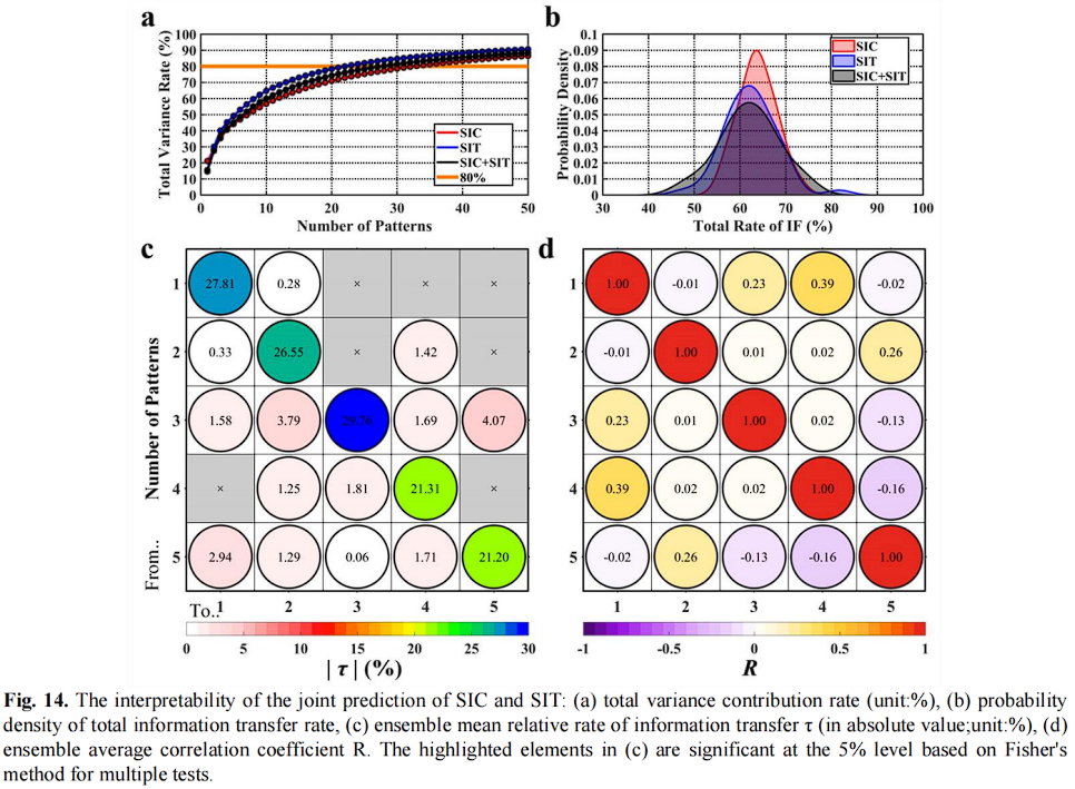 在当前框架中,自影响意味着可变状态的动态依赖于可变状态本身。除了自影响,不同PCs之间的双向信息传递表明SIC和SIT的某些模式之间存在交互。如图14(a)所示,前5个模式提供了约50%的SIC和SIT的空间演变信息。